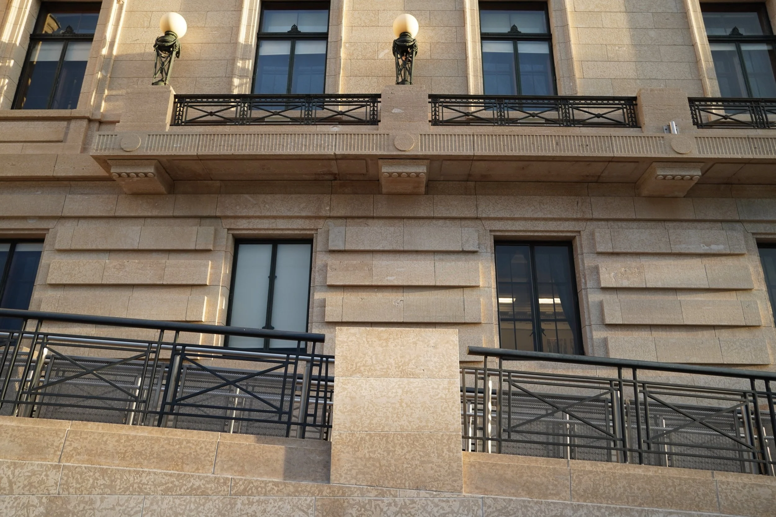 The Manitoba Legislative Building was the first legislative building in Canada to provide full access at its front doors, with the completion of a universal access ramp at the front entrance. (Read the 2007 press release.) Every person is entitled to full and equal access to the Manitoba Legislature. This project ensured that this right is now a reality. Two descending ramps on the east and west sides of the building were created in the 1970s, prior to best practices for access, and had posed several problems. Providing universal access (visual and physical) for all those visiting the Manitoba Legislative Building ̶ through the intended doors of entry ̶ required design sensitivity to this National Heritage Site. The award-winning Path to Full Citizenship reveres the heritage elements of the building. The robust limestone ramp addition was designed to express the timeless qualities of the Legislative Building. To ensure complete reversibility, however, a cantilever was created to support the entire weight of the ramp. The limestone for the ramp was sourced from the same quarry as the original building.